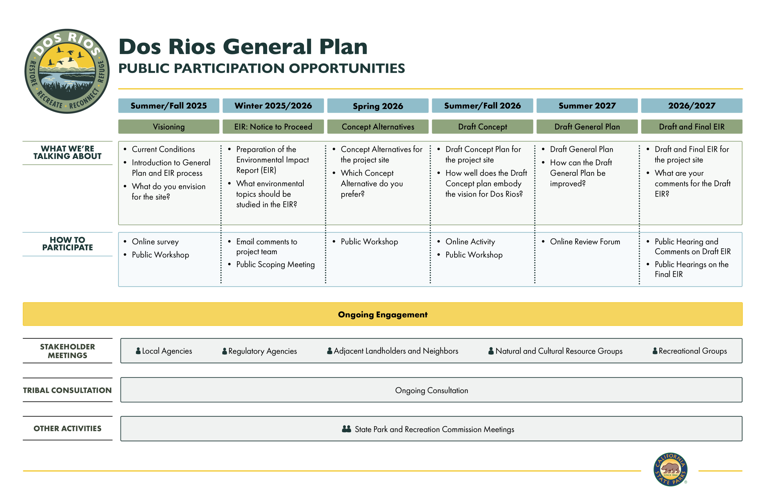 ¡Ayude a dar forma al futuro de la propiedad de Dos Ríos! Sus opiniones y comentarios son una parte importante del proceso del Plan General. Las oportunidades para participar se publicarán aquí. También puede encontrar información sobre eventos anteriores aquí.